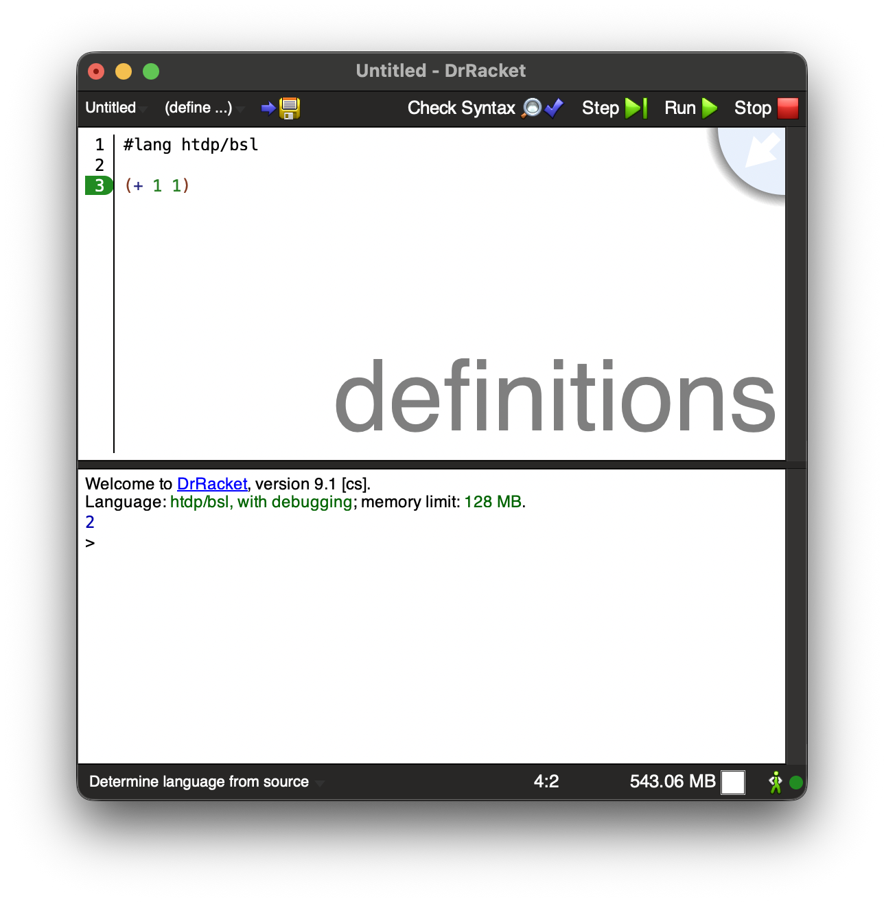 which DrRacket rewards by shading the area between the pair of parentheses. - When you click RUN, DrRacket evaluates the expressions in the definitions area and shows their result in the interactions area. Then, DrRacket, your faithful servant, awaits your commands at the prompt (>). The appearance of the prompt signals that DrRacket is waiting for you to enter additional expressions, which it then evaluates like those in the definitions area: