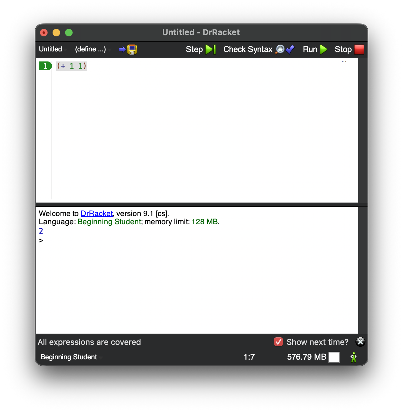 Enter an expression at the prompt, hit the “return” or “enter” key on your keyboard, and watch how DrRacket responds with the result. You can do so as often as you wish: